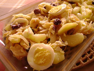 Em uma tigela ou travessa colocar o bacalhau, as batatas, a cebola, as azeitonas, o cheiro verde, os ovos cortados em rodelas, temperar tudo com vinagre, o orégano e o azeite. Provar o sal e adicionar caso haja necessidade. Levar à geladeira e servir gelada.
