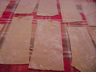 7- Depois de cortada a massa, deixar descansar sobre um pano muito limpo, polvilhada com farinha para evitar que grude.