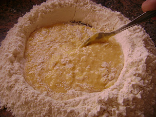 A quantidade de água dependerá do tipo de tempo que está fazendo e do tipo de farinha, portanto sempre é bom colocar a água aos poucos até dar o ponto de uma massa firme.Modo de fazer:
