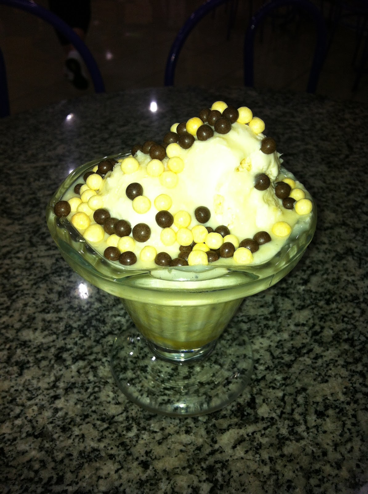 Pegar uma taça de sorvete e despejar na lateral leite condensado. Quando você colocar as bolas de sorvete isso causará um efeito muito bonito, além de “temperar” o próprio sorvete. Caso queira, você poderá colocar um pouco do chocolate granulado.