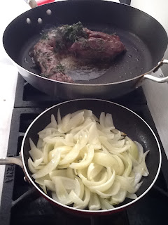 Fatiar 2 cebolas grandes em pétalas e levar ao fogo numa panela com azeite e dourar bem, mexendo sempre para não queimar, adicionar sal e servir juntamente com a carne.