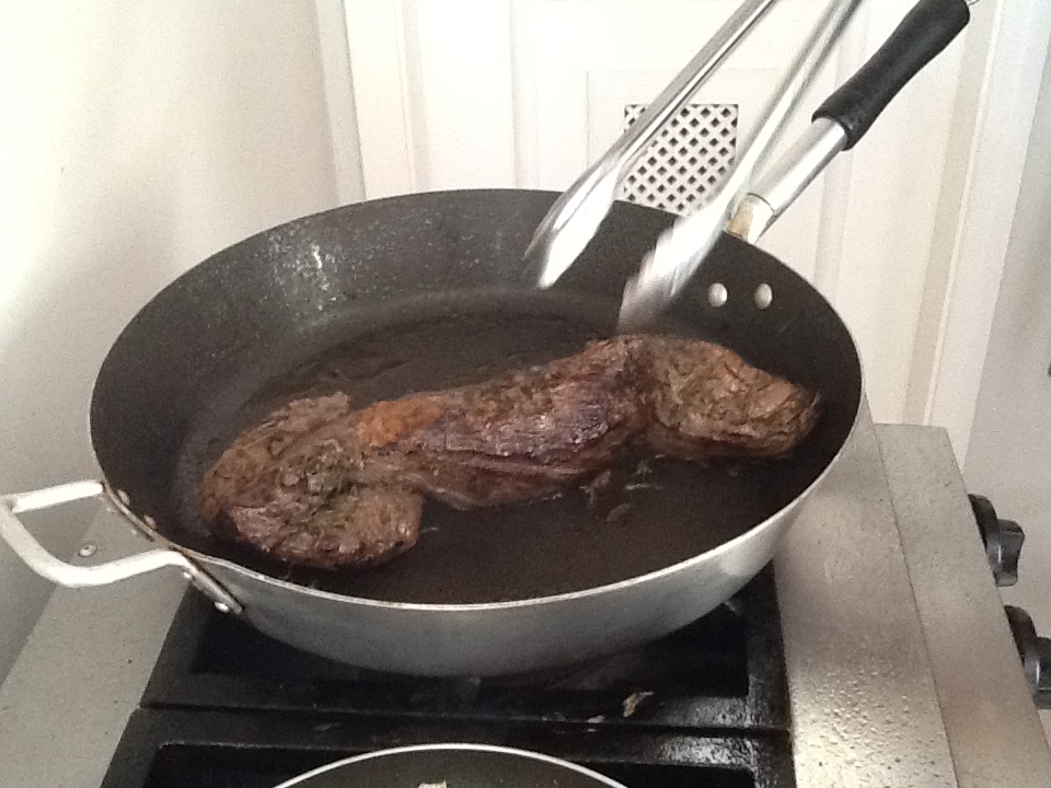 Quando a carne estiver bem dourada de todos os lados, fatiar e voltar para a frigideira para finalizar a cocção, no ponto desejado.