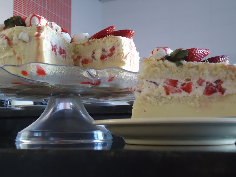 Desenforme, aplique o chantily, faça ranhuras com um garfo, disponha os suspiros e os morangos inteiros. Regue com a calda de morangos.